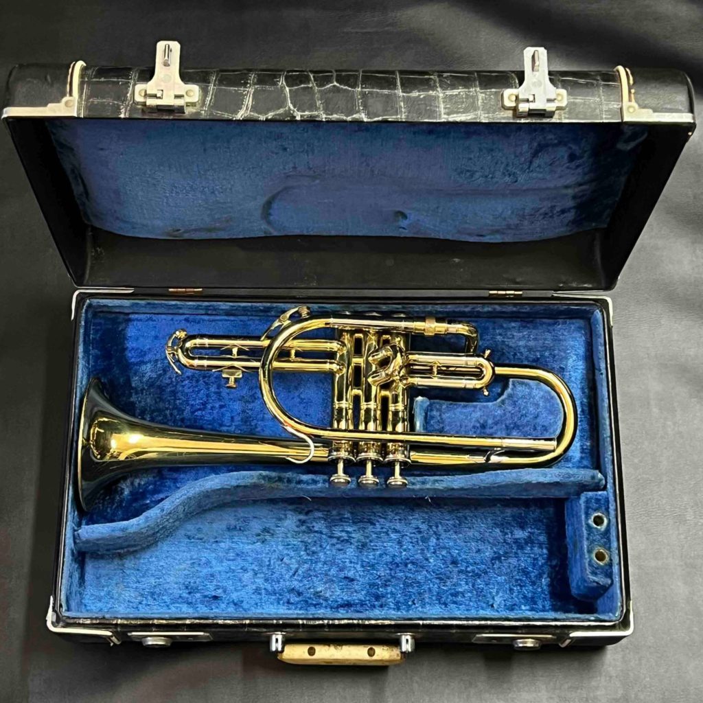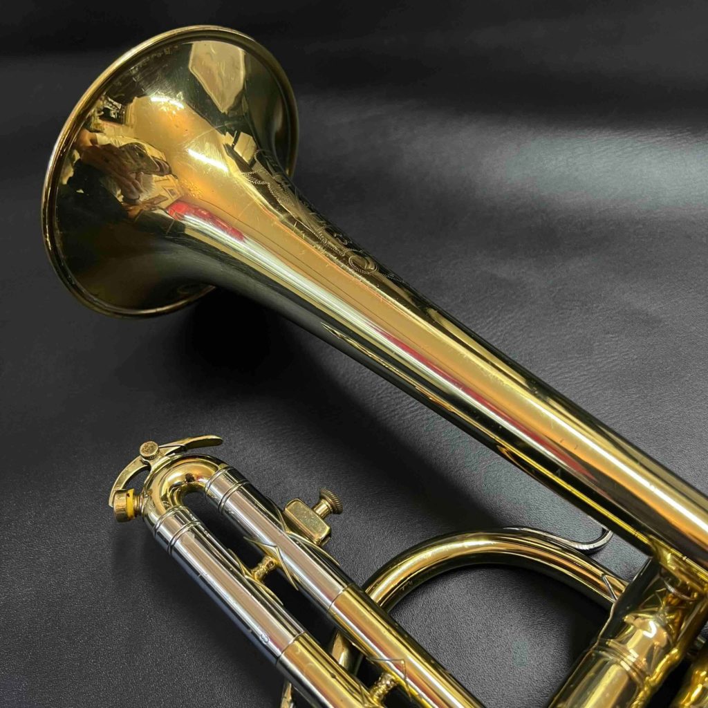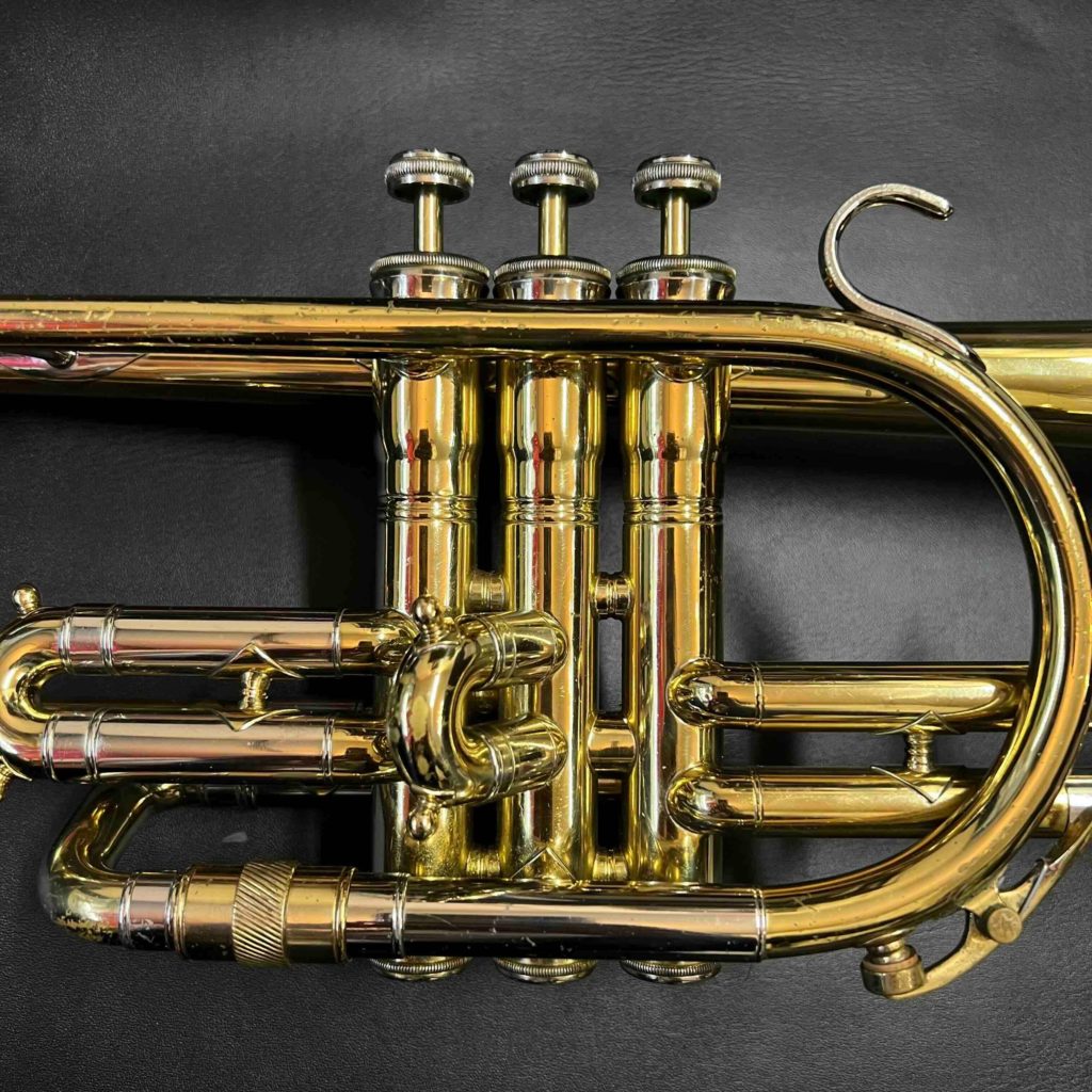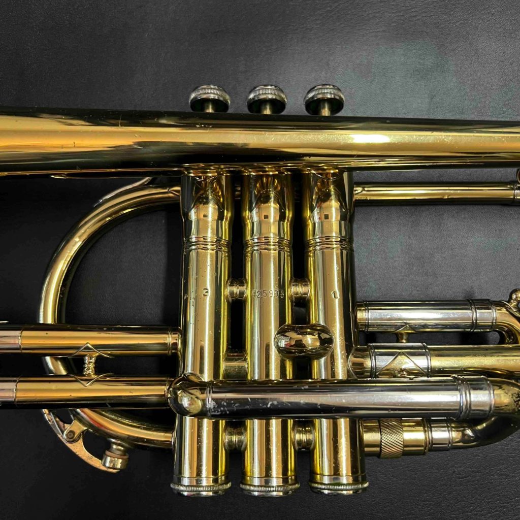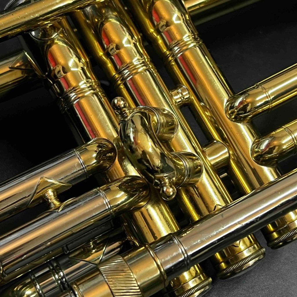 - 小さな凹みが数ヶ所あります。メインチューニングスライドから3番ピストンに入る枝管に当て金がしてあります。リラッカーですが、大きな事故も見られずまずまず良い状態です。ピストンもバッチリです。
